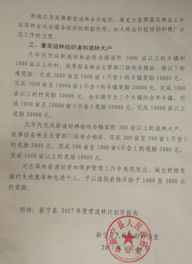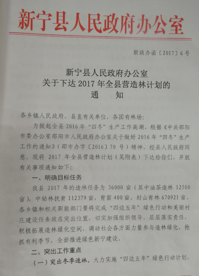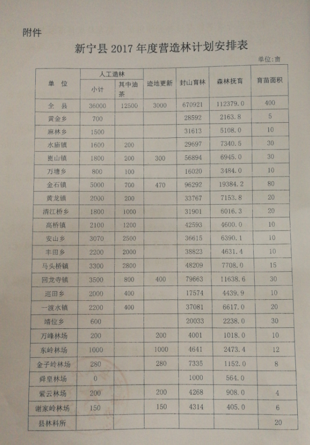 新宁县人民政府办公室关于下达2017年全县营造林计划的通知